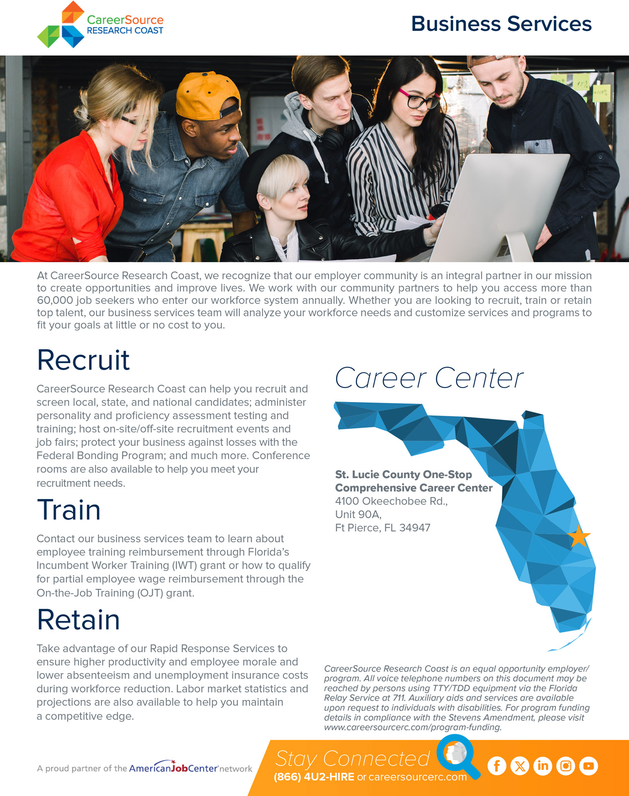 Our professional Business Navigators serve as liaisons to the business community; they analyze an employer’s workforce needs and customize services and programs to fit their goals.